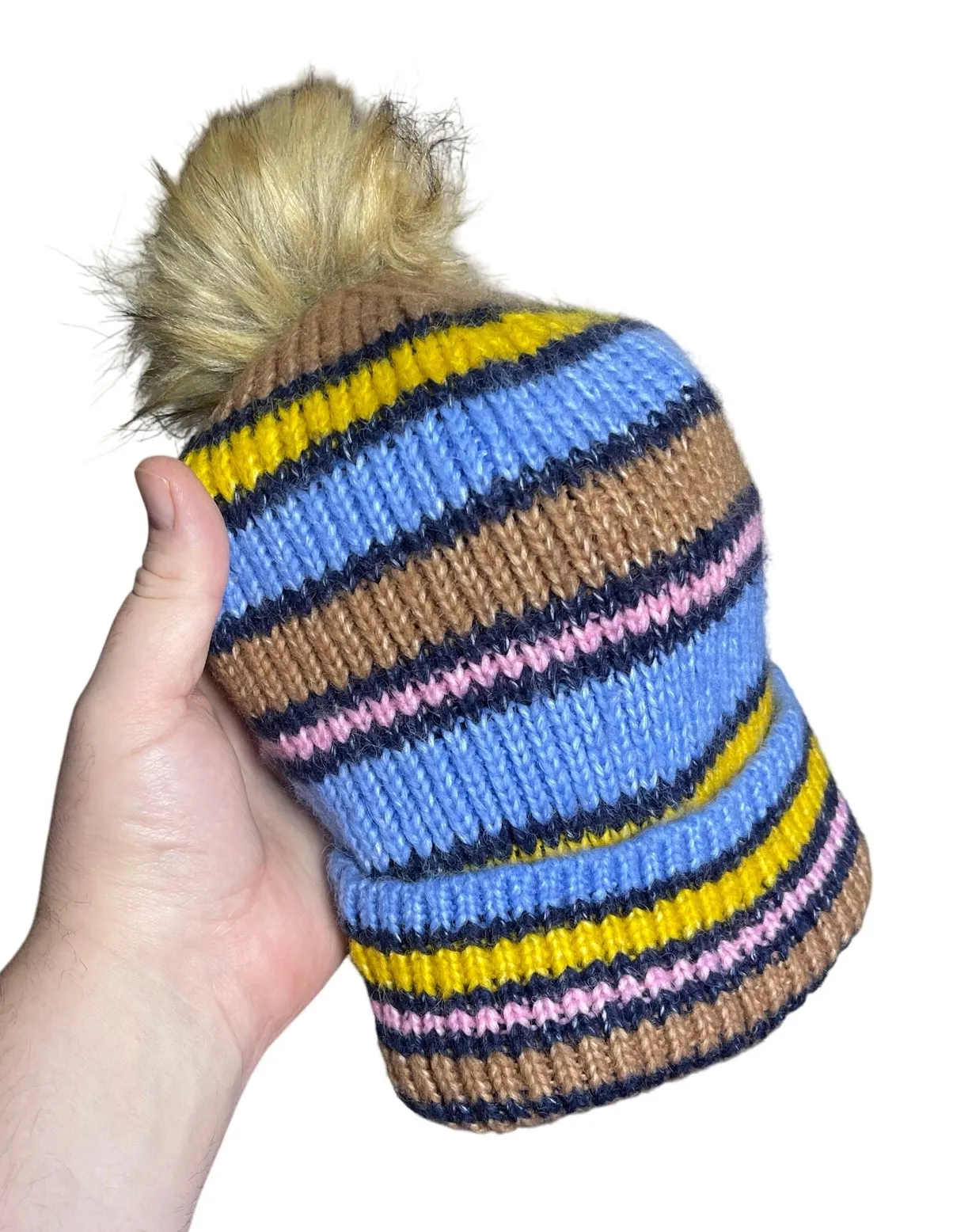 NWT AERIE Women’s Multi Striped Wool Blend Faux Fur Puff Ribknit Beanie Blue, pink and neutral mul... Show more