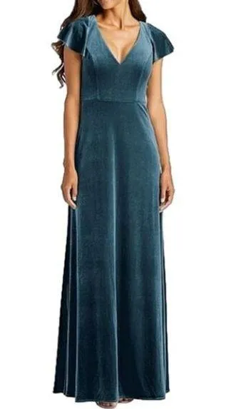 Size 8 Regular New with tags. No flaws. Crafted with luxurious velvet fabric, the dress features beautiful flutter sleeves and pockets for an elegant and stylish look. Maxi length, floor length Zip back closure Tie back detail V-neck Color: Dutch Blue Material: Shell 95% Polyester 5% Spandex, Lining 100% Polyester Care: Dry clean RETAIL $202 Tags: gown, event, party, holiday, new year's Bust: 16" Waist: 14" Length: 60" Not sure if it will fit? Measure 1 or 2 of your favorite clothing items and compare. Measurements are approximate flat-lay.