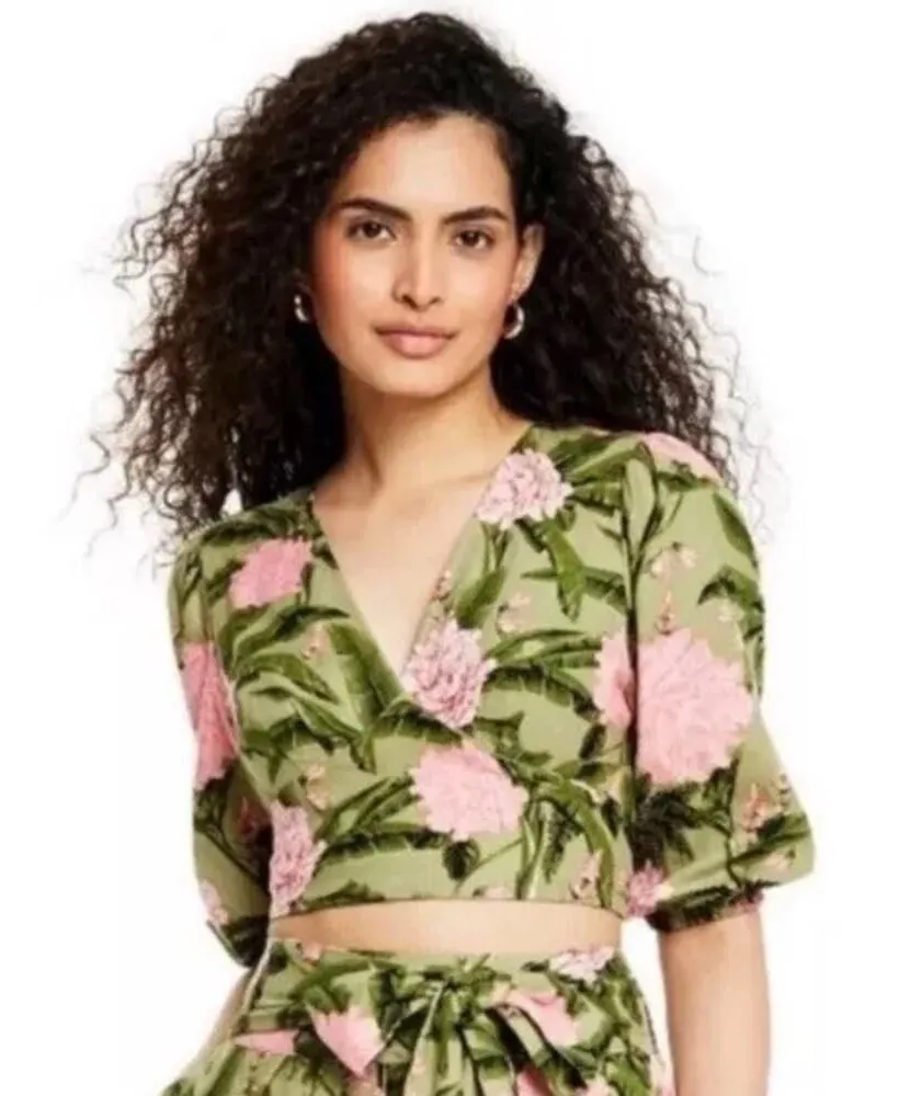 The NWT Agua Bendita x Target Peony Floral Wrap Top in a green and pink color palette is a stylish and versatile piece perfect for the summer and spring seasons. This 3/4 sleeve blouse is made from a comfortable linen blend material, making it ideal for various occasions such as travel, parties, or casual outings. The cropped style and floral pattern add a touch of femininity to this chic top. 17 bust 15 length