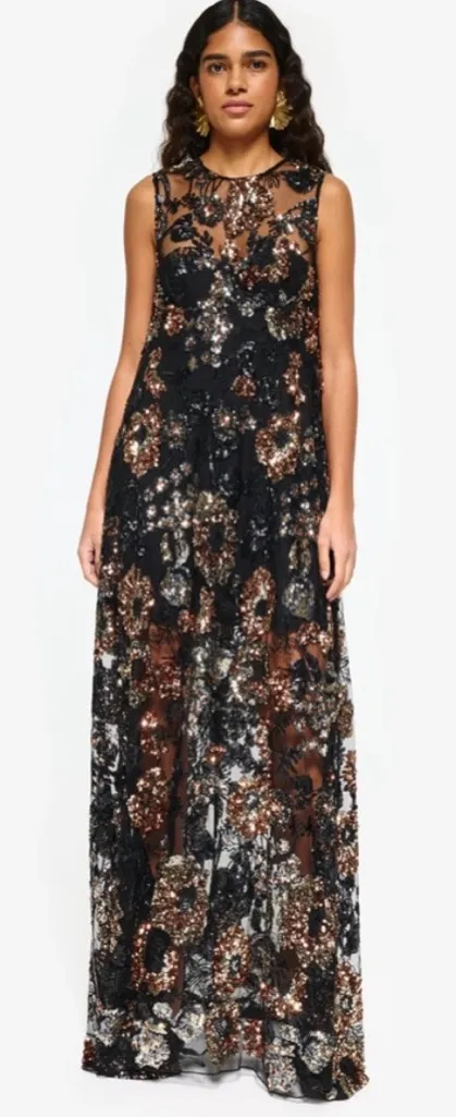 NWT This gorgeous AKNVAS' gown is crafted of sheer fabric adorned with decorative gold and black sequins. The Maja is a modern statement piece for any special occasion. Features: Roundneck Sleeveless Back zip closure 100% polyester Dry clean Made in USA Model is shown in a size 2. We recommend ordering true to size. COMPOSITION 100% polyester