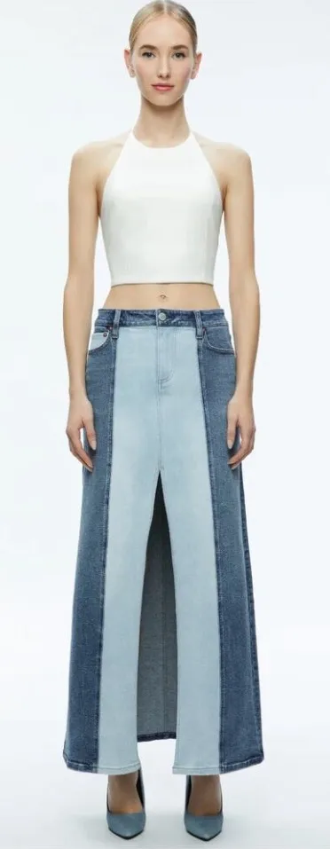 Alice + Olivia Rye Low-Rise Two-Tone Denim Skirt • Alice + Olivia "Rye" two-tone demim skirt Five-p... Show more