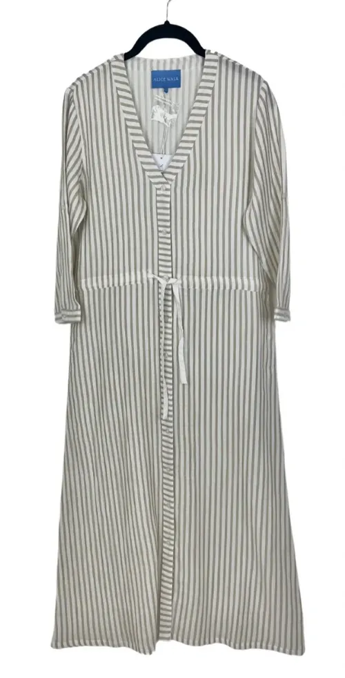 Alice Walk tan and white striped long dress with cropped sleeves, button up front closure, v-neckline and adjustable drawstring waist in a lightweight, soft and semi sheer fabric Size Extra Small (Size 0-2), Small (Size 4-6), Medium (Size 8-10), Large (Size 12-14) and Extra Large (Size 16) Fabric Contents: 100% Cotton Alice Walk designs high quality pieces made with premium fabrics. Founded on the belief to pair classic silhouettes with beautiful, unique fabrics to create a fresh-yet-timeless wardrobe. Their effortlessly chic brand has a store in Nantucket and is perfect for elevated essentials for the beach and beyond.