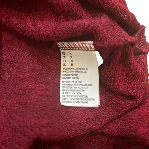Burgundy textured long sleeve sweater with lace detail. Vents at the side hem. Cute with leggings... Show more