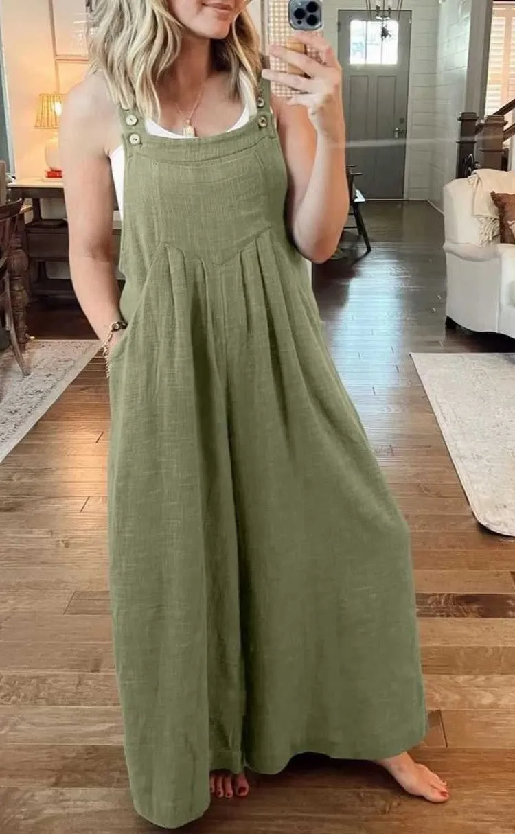 Brand: Anrabess Size: Large Color: Olive Green Sleeve length: Sleeveless Features: "This overalls jumpsuit is designed with adjustable shoulder straps, button detailing, sleeveless style, square neckline, pockets, and a loose casual fit. Perfect for comfortable and stylish travel." Style: "Our overalls are versatile and chic, suitable for any occasion. The loose, baggy fit, wide legs, and long pants make this romper perfect for everyday wear or dressed up for special events. Roll up the legs for a new look." Occasion: "Ideal for summer beachwear, home or daily wear, holidays, and travel. Mix and match with T-shirts, tops, blouses, and sneakers for versatile style." Theme: beach, boho, bohemian, cottagecore, cottage, loungewear Current on Anrabess website ($72 new)