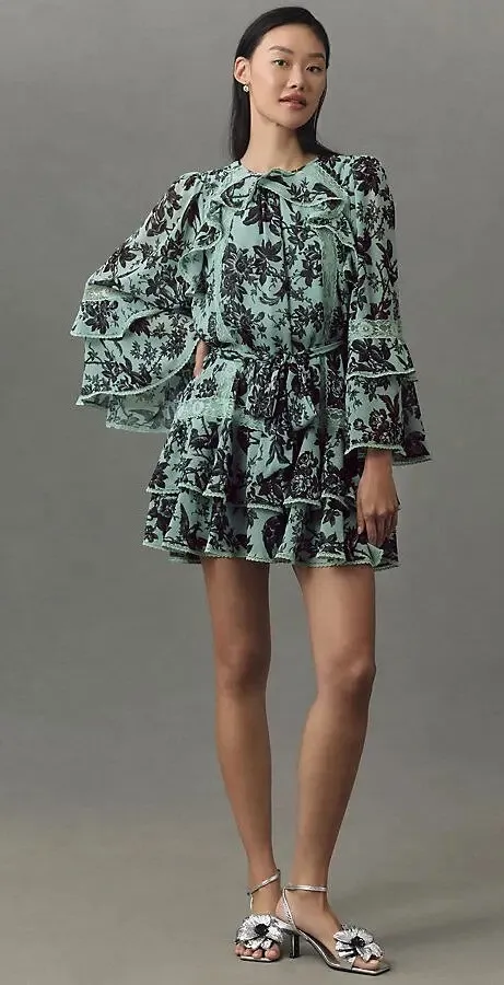 New with tags NWT. Retailed $298. NWT Anthropologie BHLDN Camila Long-Sleeve Chiffon Mini Dress. US Women’s Size Medium. Teal blue green grayish floral chiffon. Has a wrap around belt that can be tied around waist or not. Same day ship!