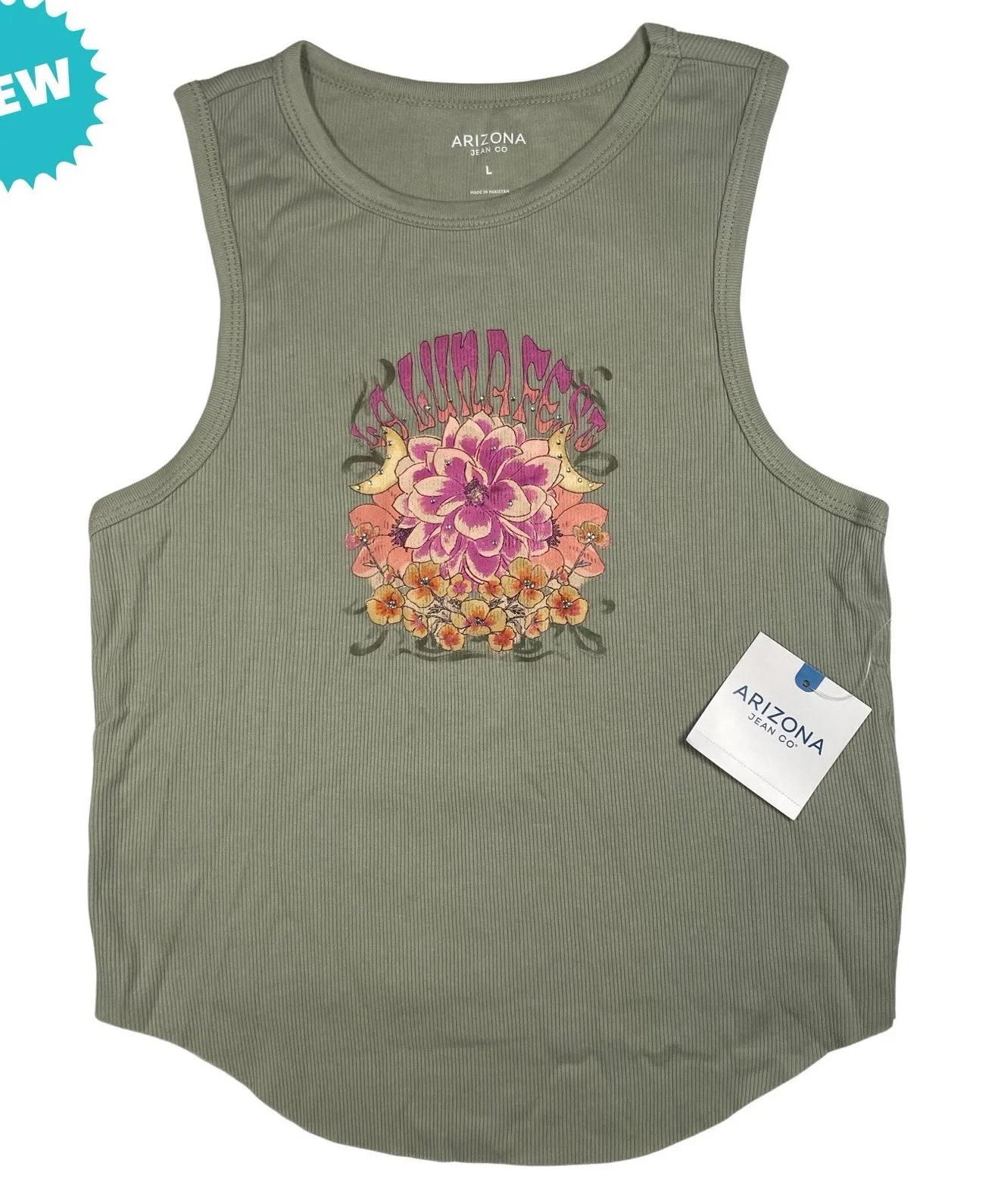 Junior’s Arizona Jean Co. graphic tank top in size large, NWT (retail $20). Soft sage green tank fea... Show more