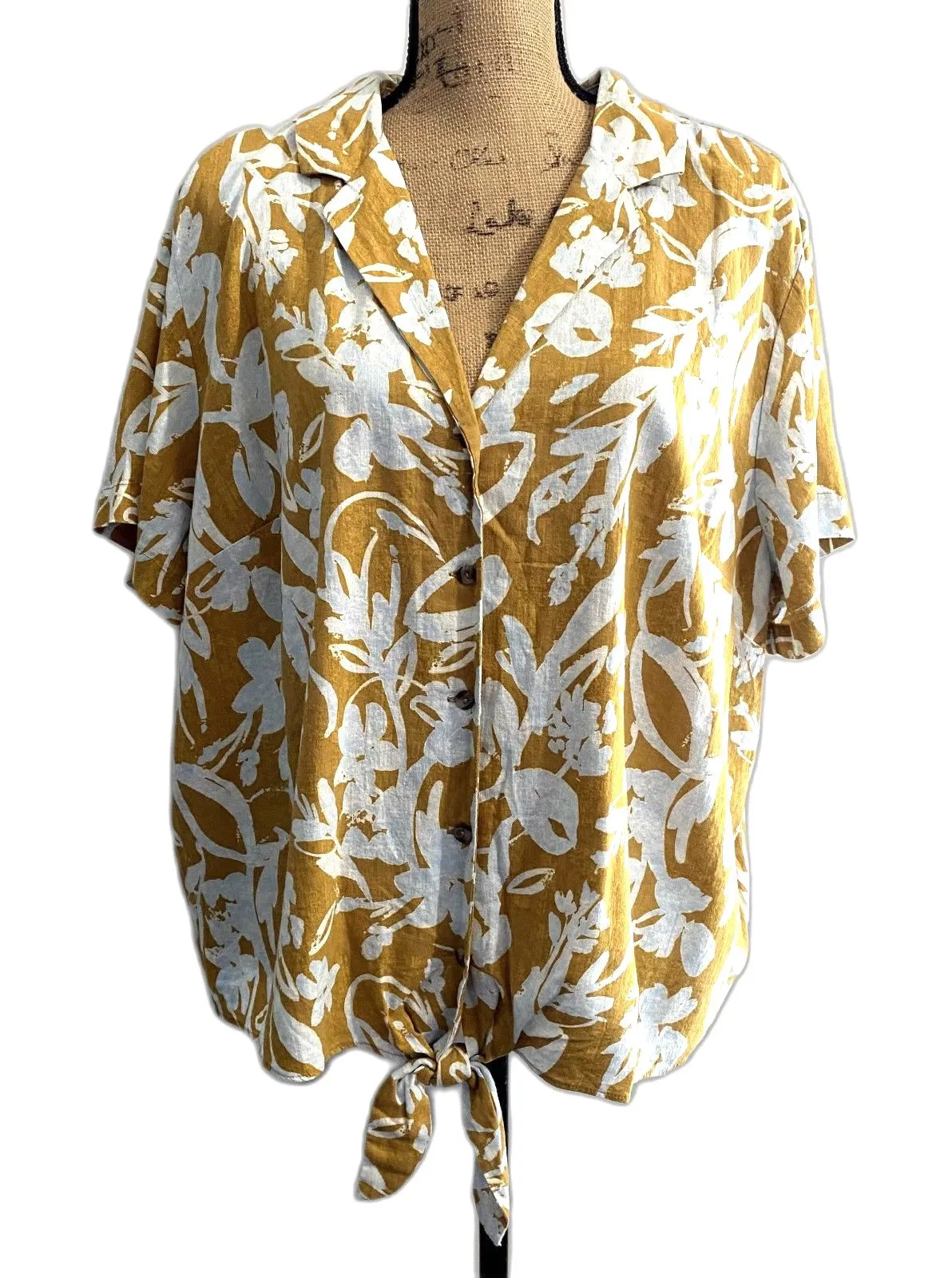 NWT Ava & Viv Tropical Floral Button Up Tie Waist Shirt Plus Size 1X Brand new with original tags still attached and with no visible flaws! Features: - Golden yellow tropical floral print - Notch collar - No gap button front - Tie front detail - 55% linen, 45% rayon - Plus size 1X casual, coastal, beachy, summer, vacation, linen blend Measurements: All measurements taken laying flat! Bust: 27 inches Length: 23 inches Thank you so much for shopping with me, and please let me know if you have any questions! Offers are always welcome. Bundle to save.