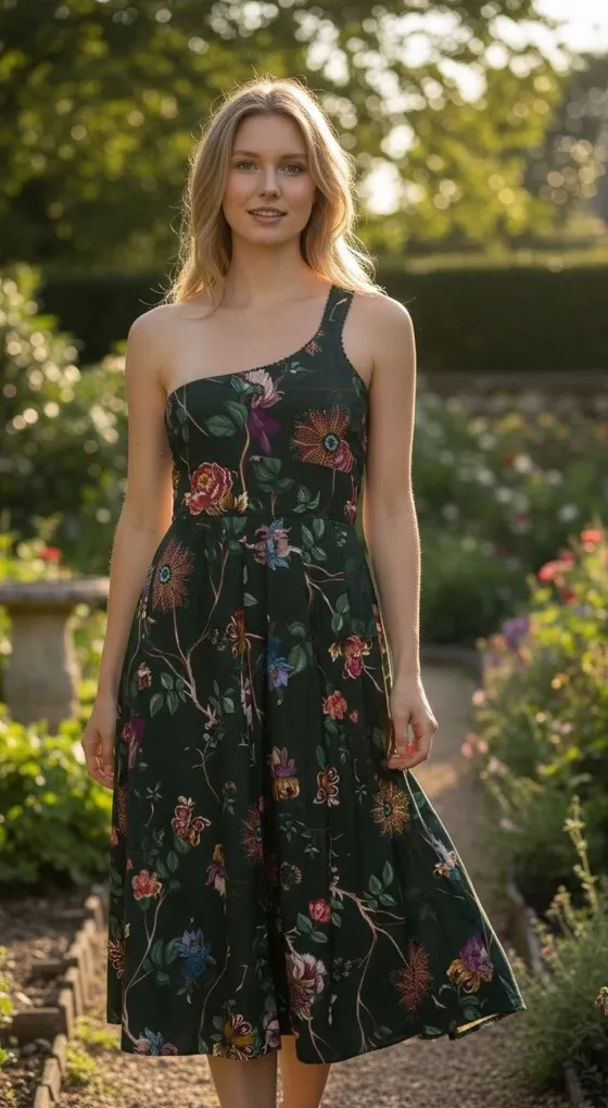 Chic one-shoulder design. Green base with vibrant floral print. Perfect for any occasion. Stunning emerald green midi dress featuring a gorgeous one-shoulder design and vibrant multicolored floral print with roses, peonies, exotic blooms, and lush foliage on a rich dark green background. This elegant, flowy fit-and-flare style has a fitted bodice that cinches at the waist, creating a flattering silhouette, and a full pleated skirt that sways beautifully with movement. Perfect for weddings, garden parties, bridal showers, summer dates, vacations, or any romantic occasion! Lightweight and breezy fabric that’s comfortable for warm weather.