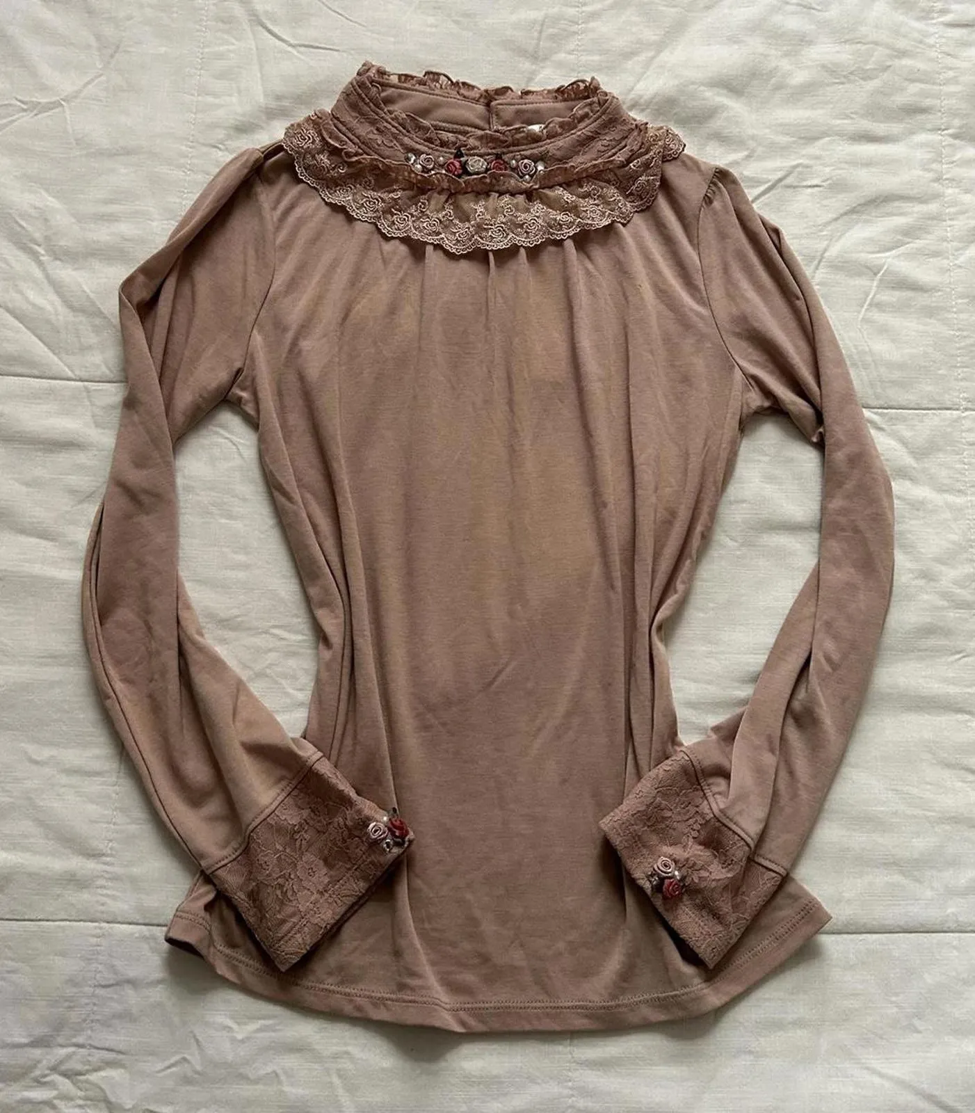 NWT Axes Femme high neck pink lace long sleeve top with embellished bib and sleeves and little rosettes. Perfect for coquette Lolita styling. Size medium, from Japan. #fairycore #cottagecore