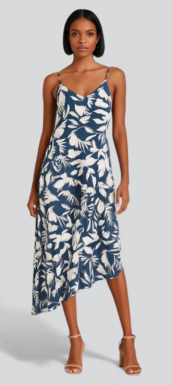 Floral tropical leaf pattern Adjustable spaghetti straps Ruffles throughout Hidden side zipper Full... Show more