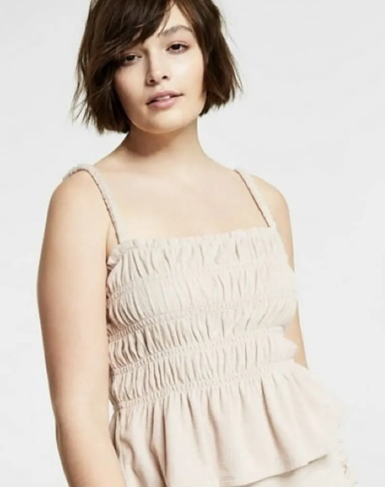NWT Bar III Women's Square Neckline Terry Ruffled Smocked Top Naturally Nude XL