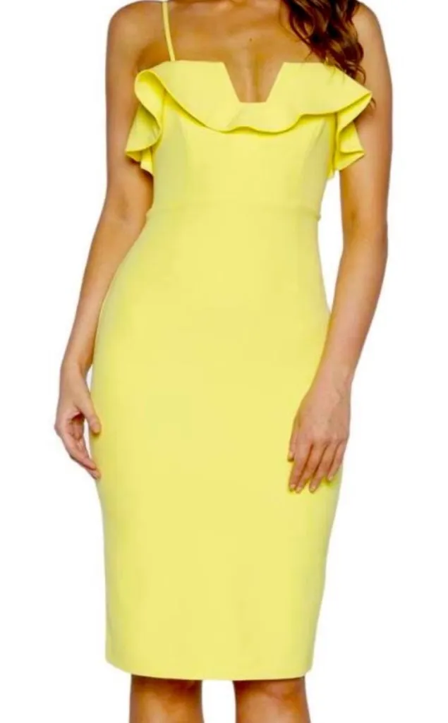 Designed in Australia Gorgeous Lemon Drop color — sunny yellow! Corset style boning for shaping Satin lining Adjustable straps Zipper button back closure Perfect for formal events; wedding guest, bridal party, prom, winter formal, school dances, Easter, and more! Please see all photos and ask all questions prior to purchasing Dust/dirt-like markings on bottom from falling on ground, line on front right near bottom Measurements are approximate, laying flat, unstretched, and on one side: Pit to pit— 19” Length top of shoulder to bottom hem — 44”, at current strap adjustment B3