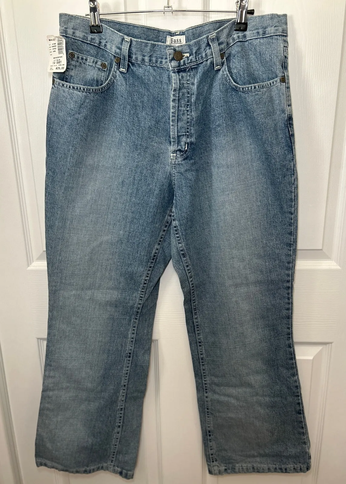 Bass Women's Bootcut Jeans Size 14S These light wash denim jeans feature a traditional five-pocket design and a comfortable fit. The versatile light blue color makes them easy to pair with a variety of tops and shoes. Perfect for casual outings, weekend errands, or relaxed social gatherings. Approximate measurements in inches laying flat: 16.5 waist, 11 rise, 10 leg opening Inseam: 29 in Material: 100% Cotton Closure: Button Keywords: Bass jeans, bootcut jeans, denim jeans, light wash jeans, size 14 jeans, womens jeans, classic fit jeans, casual jeans, blue jeans, new with tags, NWT, straight leg jeans, cotton jeans