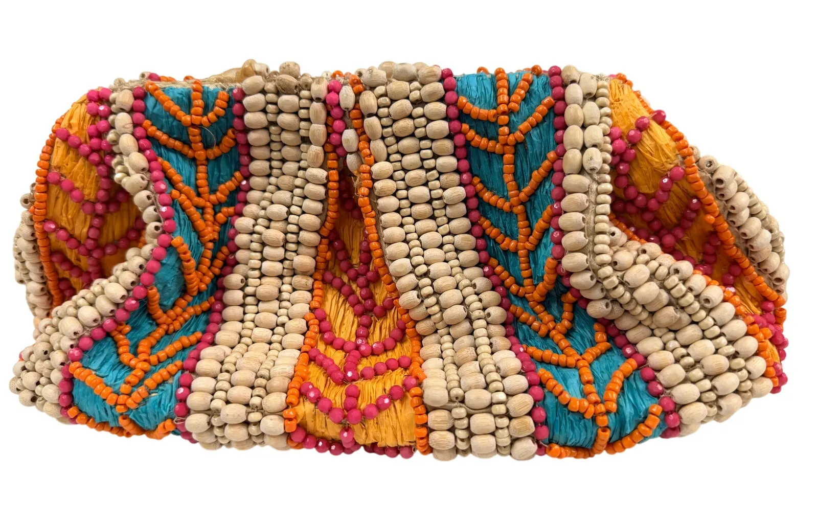 New With Tags — Hand-embroidered and beaded artisan clutch/crossbody bag. 🌿 What you’ll love about this piece: Handmade in India by talented artisans, supporting women’s collectives. Vibrant boho festival aesthetic with hot pink, turquoise, orange, and natural wood beads. Convertible style: can be worn as a clutch or with the included silver-tone chain strap. Fully lined interior with secure closure. Measurements (approx.) Width: 12” Height: 7” Depth: 5” Strap drop: 20” Condition Brand new with tags, never used. Style Aesthetics 🔥 Festival / Coachella vibes 📈 Boho chic & artisan handmade 🌿 Ethical slow fashion Styling Tips Perfect with flowy maxi dresses, denim shorts + crochet tops. Adds a bold pop to simple neutral outfits. Great for concerts, travel, or summer weddings. Sustainability Note Sustainably artisan-made — handcrafted from natural and repurposed materials, not fast fashion.