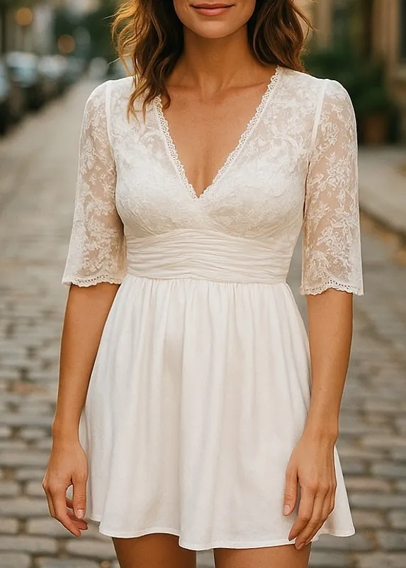 This beautiful eggshell wedding dress is BRAND NEW and has never been worn! It is short length and has 3/4 sleeves. The bodice and sleeves are lace and the sleeves are angled long on the outside. The bodice has a wonderful satin layer under the lace. The front and back are low cut. The back features a zipper closure at the waist and a tie closure at the neckline. Perfect for a wedding in the summer, spring, fall or winter! There is a measurement card included that reads the following measurements: Height: 57.5" Bust: 38" Waist: 30 Hip: 36" Hollow to hem: 34" All items come from my SMOKE FREE home!