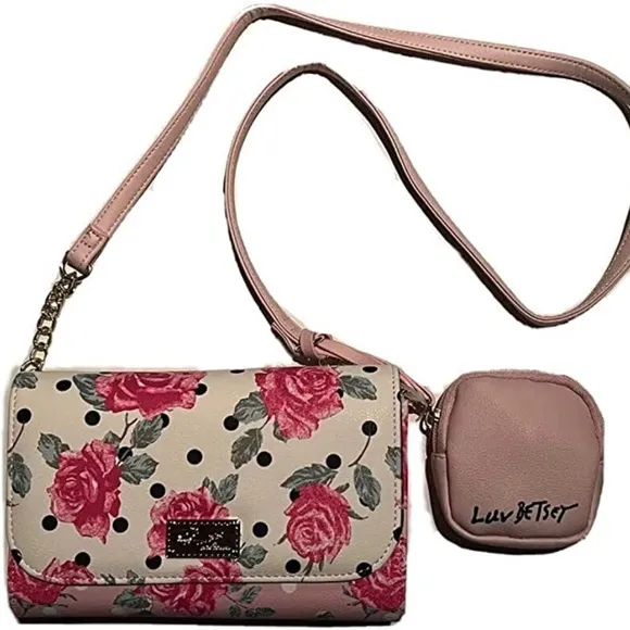 Cross body bag with cute coin bag Has cute gold chain details Card pockets inside bag