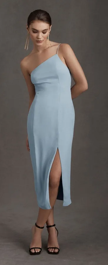 NWT BHLDN Women's size 12 Light Blue One Shoulder Anamaria Georgette Midi Dress. BHLDN brand women's dress in a size 12. Item is new with tags attached. Colorway is light blue. One thin strap over the left shoulder, strappy at the back. Zipper closure at the side. Slit at the front leg. Midi length dress. Beautiful dress, perfect for any formal occasion. Measurements as pictured. In great condition, see photos for more details. Always feel free to ask any questions you may have! Reasonable offers accepted. wedding, wedding guest, bridesmaid, midi, strappy, formal, classy, cocktail, black tie