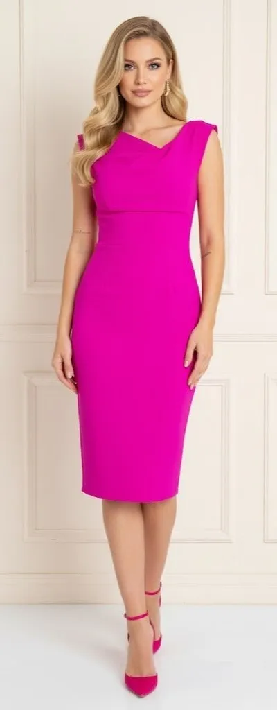 Up for purchase today is... Designer: Black Halo Size: 8 Fit: Please do not go by size number but rather check measurements listed below to determine if the item will fit. Color: Vibrant Pink Style/Design #: 6603058 Material: 88% polyamide, 12% elastane / Lining 96% polyester, 4% elastane Details: * Small cap sleeves frame the draped, asymmetrical neckline that tops a tailored sheath. Crafted in Cady Bi Stretch Fabric that is a perfect summer weight option for your personal Jackie O collection. Back zip. Lined. Dry clean. Made in USA. * Condition: New with tags Retail: $375 Measurements: Chest - 35 ½" Waist - 30" Length - 41"