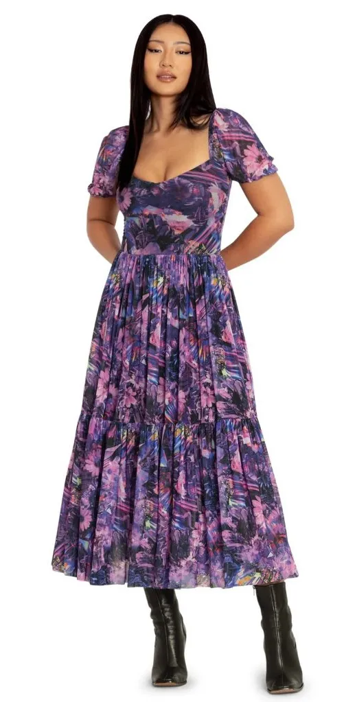 Up for purchase today is... Designer: BlackMilk Size: S Fit: Please do not go by size number but rather check measurements listed below to determine if the item will fit. Color: Purple Multi Style/Design #: Crystal Forest Short Sleeve Sheer Midaxi Dress Material: 96% polyester, 4% elastane / Lining 90% polyester, 10% elastane Details: * Take a walk through the forest of your dreams, where sunlight bounces off the prisms of giant, multifaceted crystals and fills the air with colour. – Made from a sheer mesh fabric that is lined to around knee-length – Not quite a midi, not quite a maxi, this dress falls in between these lengths, around mid-calf – Cute sweetheart neckline – Short, sheer sleeves with elasticated hems – Unhemmed skirt for the perfect flow. Lined. Machine wash. Imported. * Condition: New with tags Measurements: Chest - 30" Waist - 26" Length - 47"