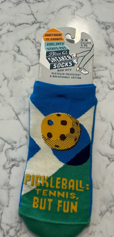NWT Blue Q Pickleball Sneaker Socks Size Large XL (Woman’s 9-23 Men’s 8-12) Socks say “Pickleball: Tennis but fun” This is in new condition. Items shipped same or next day. Weekend orders shipped Monday.