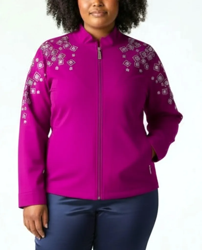 The NWT Bob Mackie Wearable Art Size 1X Barbie Pink Jewel Embroidered Jacket is a stylish and colorful garment designed for women. Made from cotton, this plus-size jacket features intricate embroidered details that add a touch of artistry to the basic jacket style. The pink color adds a playful and vibrant element to the overall design, making it a trendy and eye-catching piece for any wardrobe. * Approximate measurements: Bust (Pit-to-Pit) 25.5in, 51in total; Length 25in (from shoulder to hem)