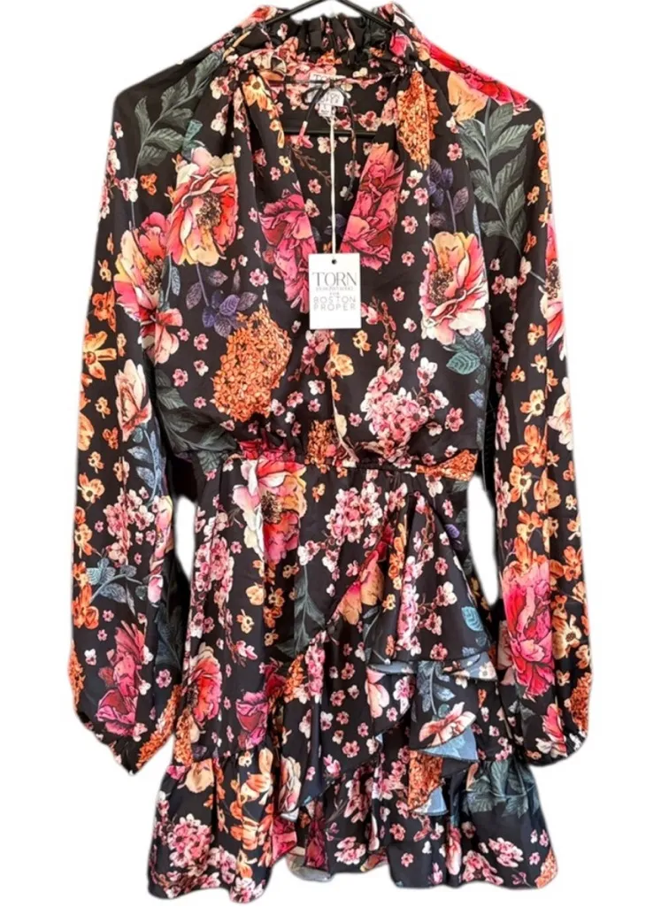 New with tags; This dress is SO beautiful and 100 times prettier in person!!! Black floral polyester; ruffled/tie neckline; puff sleeves with elastic cuff; ruffled skirt; gathered ruffle detail on hip; elastic waistband; partial side zip; pit to pit measures approx. 18.5" across; shoulder to hem measures approx. 33"; smoke free home.