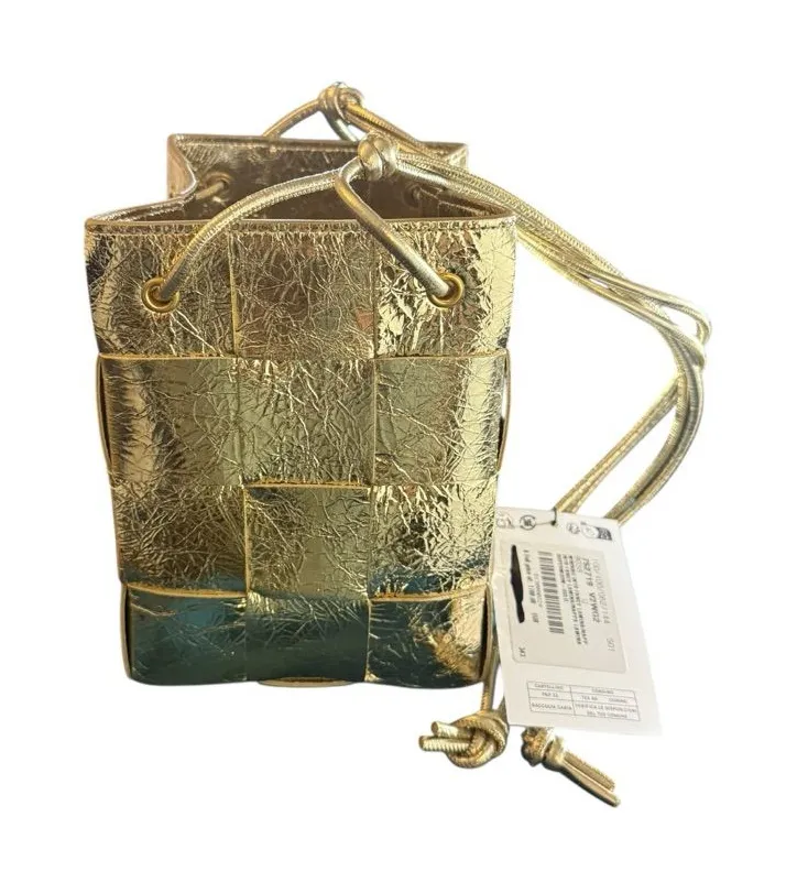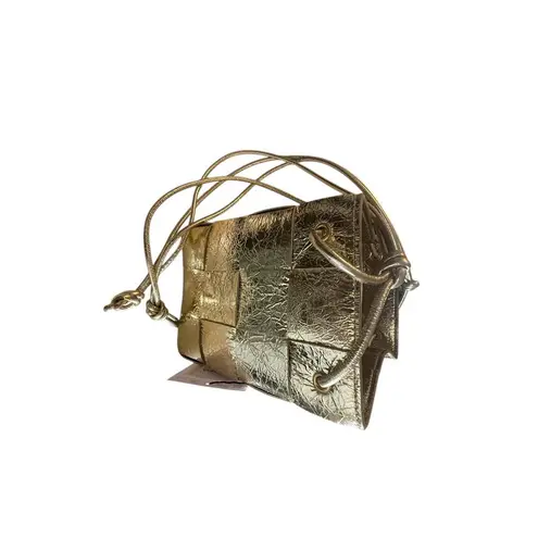Brand new with tags Bottega Veneta small crossbody bucket bag in laminated leather. Color: supermoon/gold. Drawstring closure. Comes with dust bag and care certificate. Dimensions Length: 5.5 inches Width: 5.5 inches Height: 7 inches Strap drop: 18 inches