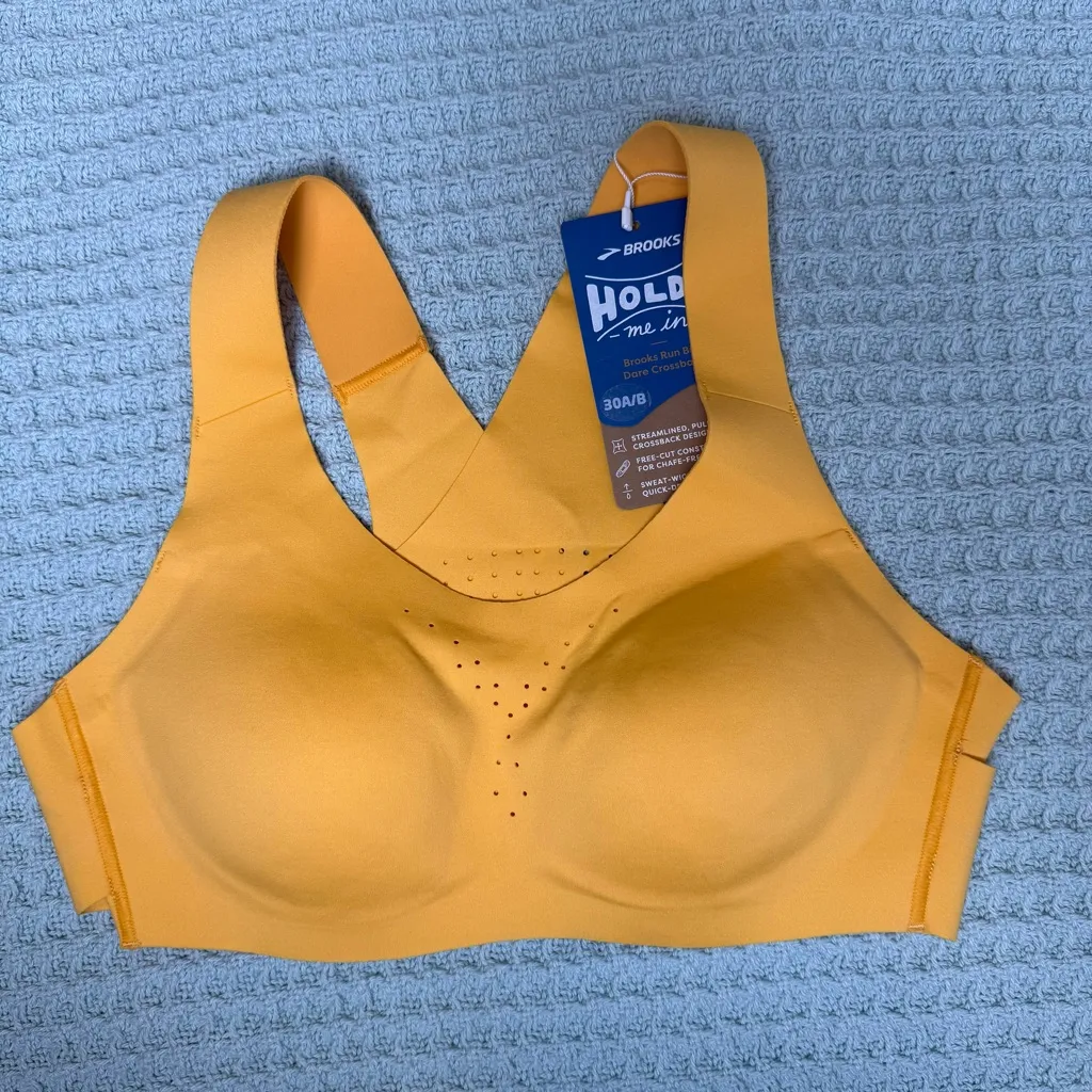 Brooks women’s Dare Crossback Run Bra. Size 30 A/B. Color is Saffron (yellow). Pullover cross bac... Show more