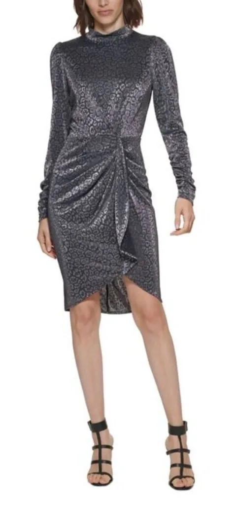 NWT CALVIN KLEIN Black Cheetah Animal Shiny Longsleeve Midi Sheath Dress Size 12 - Approximate meas... Show more