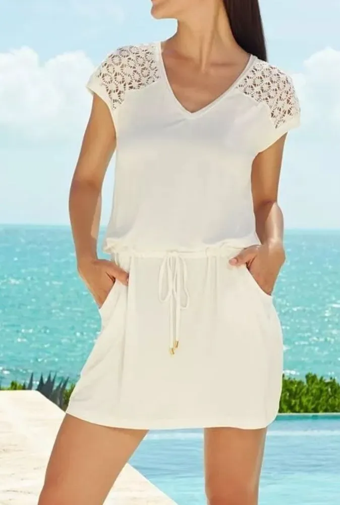Calvin Klein swimwear cover-up dress in milk white. Features a lightweight, soft fabric with beautif... Show more