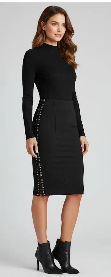 Up for purchase today is... Designer: Catherine Malandrino Size: L Fit: Please do not go by size number but rather check measurements listed below to determine if the item will fit. Color: Black Style/Design #: 32YSJ109 Material: 71% viscose, 24% polyamide, 5% elastane Details: *A to-the-knee pencil skirt conveys a sleek silhouette. The simple garment is given a glam slant with lace-up side detailing down the right side. With a body-hugging fit, this skirt is begging to be paired with your favorite sky-high pumps. Side zip closure. Lace-up detail at right side. Knit stretch ponte. Unlined. Dry clean. Made in USA. * Condition: New with tags Retail: $245 Measurements: Waist - 30" Hips - 36" Length - 24"