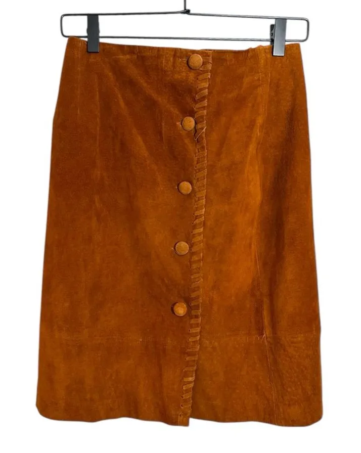 NWT Cedars for Saks Fifth Avenue Suede Button Front Skirt Vintage Size 10 in Cognac Brown Genuine 100% leather suede skirt in “cognac“ a caramel tan/brown Button-front design with textured seam detailing Fully lined with acetate interior for comfort Elegant structured silhouette New with original Saks Fifth Avenue tag A skirt that looks like it belongs in a 1970s Parisian art film — the suede, the structure, the romance of every soft fold. It’s that timeless, bohemian-luxury energy that works with anything from turtlenecks to silk blouses. Condition: NWT, New with original Saks Fifth Avenue tag (no cedars brand tag) *Please check photos carefully for any wear from storage. Photos are accurate and considered part of the item description. Ask any questions, happy to help! Stored in a smoke-free/scent-free/climate-controlled environment. Color may vary on different screens. Photos are taken in Natural and Artificial lighting for your convenience. vintage aesthetic fall fashion boho chic teacher cottagecore 70sstyle quiet luxury TikTok outfit preppy vibes timeless look female fashionista western farmhouse coastal cowgirl scandigirl scandi