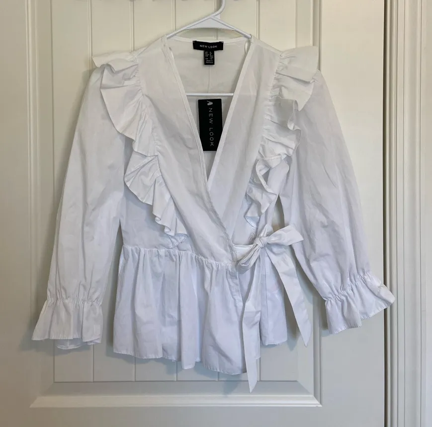 Women’s Charlotte Russe New Look poplin blouse. Top is solid white with a wrap design & ruffle decor... Show more