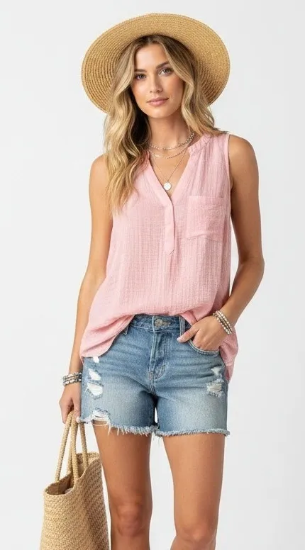 New with tags Sleeveless Split V-neck Band collar Button front closure Woven fabric Lightweight Ches... Show more