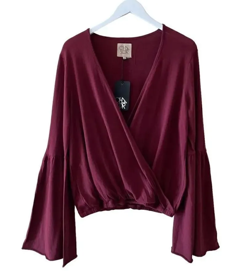 NWT Chaser Revolve Cotton FLARED SLEEVE SURPLICE Faux Wrap Top Old Zin Burgundy Sz M Measurements... Show more