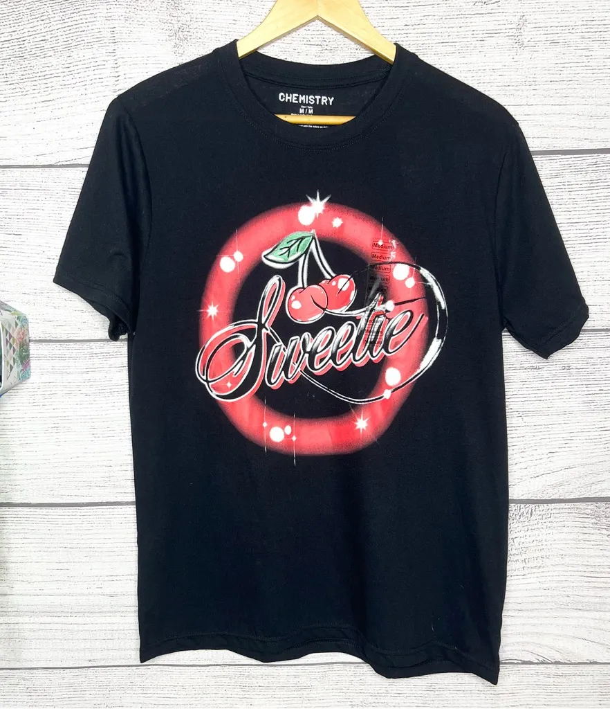 NWT Chemistry Black & Red Sweetie Cherry Airbrush Graphic Tee Unisex Size Medium Approximate flat lay measurements: Pit to pit: 20 inches Length from shoulder to hem: 27 inches Black tee with vibrant red and white graphic. Features 'Sweetie' text and cherry design. Ideal for casual wear.