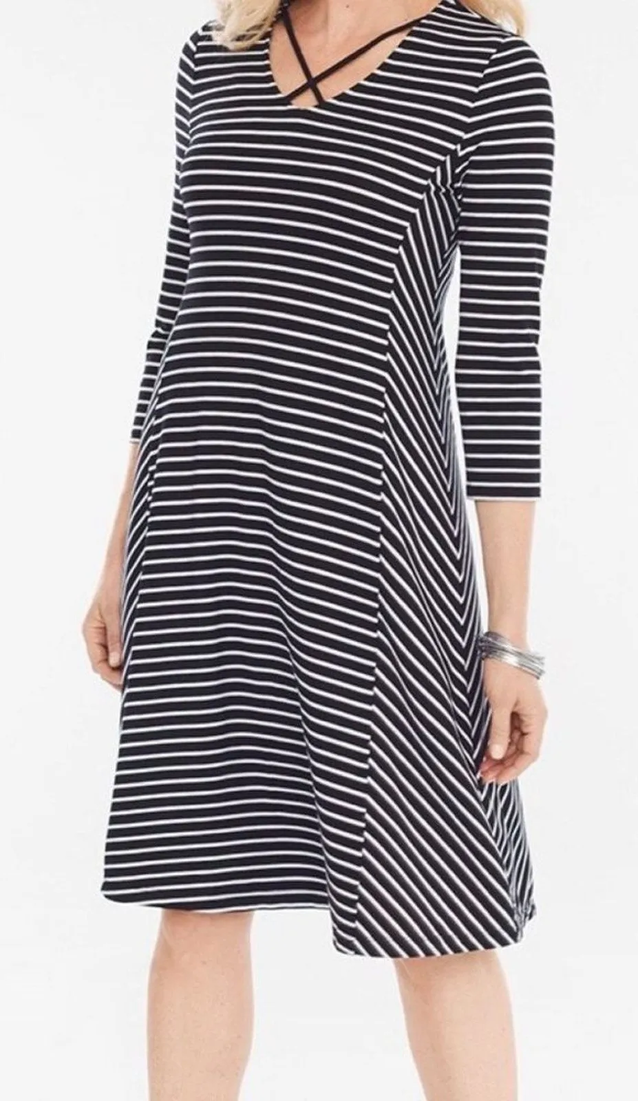 NWT Chico's Lace Up Detail Shift V-Neck Dress 3/4 Sleeves Stripped Black White, Size Chico's 3 (US X... Show more