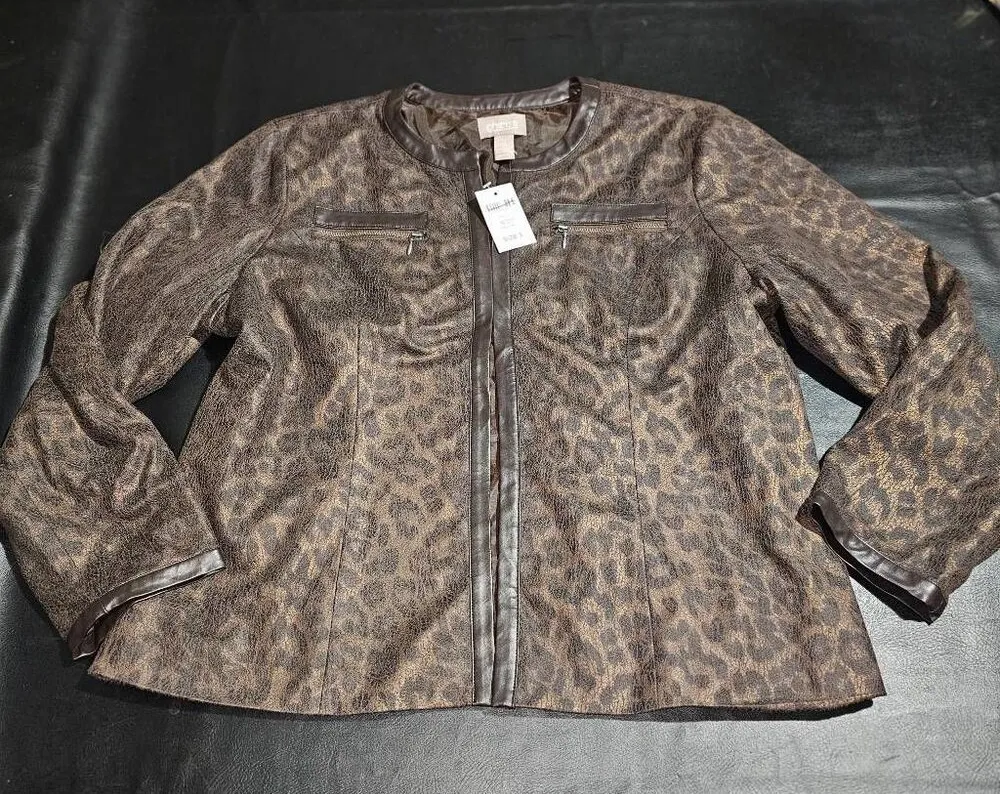 NWT Chico's Womens Brown Animal Leopard Print Faux Leather Trim Jacket 3 XL 16 Bust: 48" Arms: 25" L... Show more