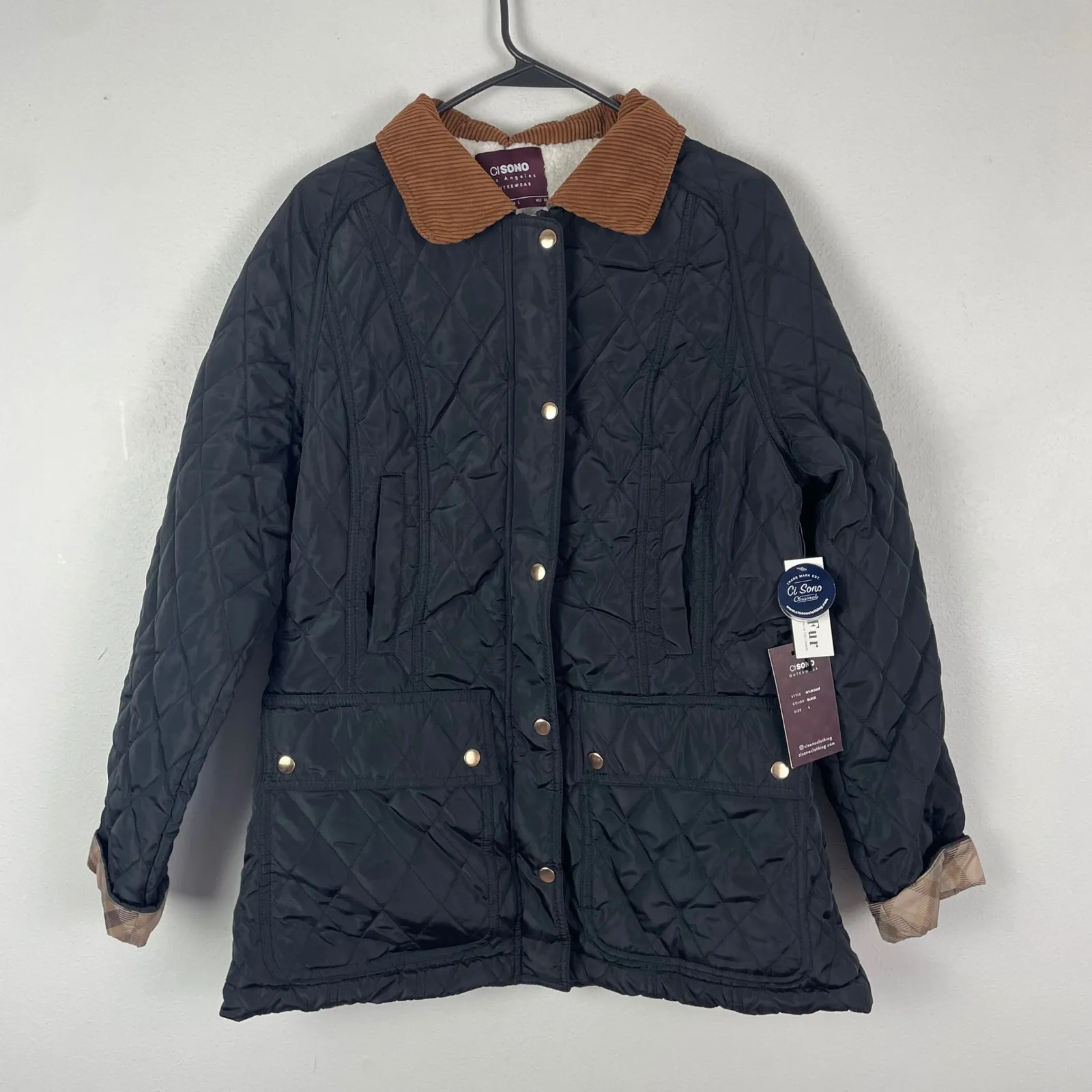 A women's black quilted jacket from CI SONO Los Angeles. This stylish outerwear features a warm sher... Show more
