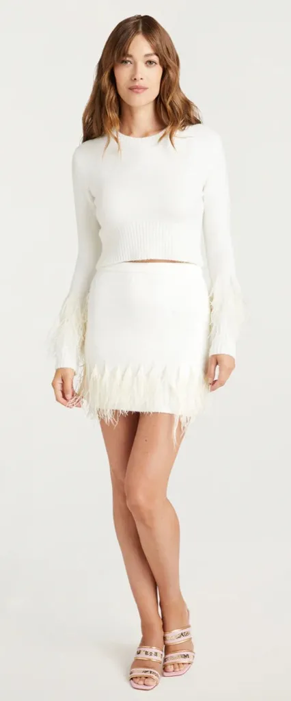 DETAILS Pull on closure Fabric: Knit Cropped silhouette Feather details Long sleeve CONTENT AND CARE 70% Acrylic 27% Nylon 3% Spandex Dry Clean Imported MEASUREMENTS 16in/40.64cm from top edge Waist 13.5” Questions? Leave a comment below!