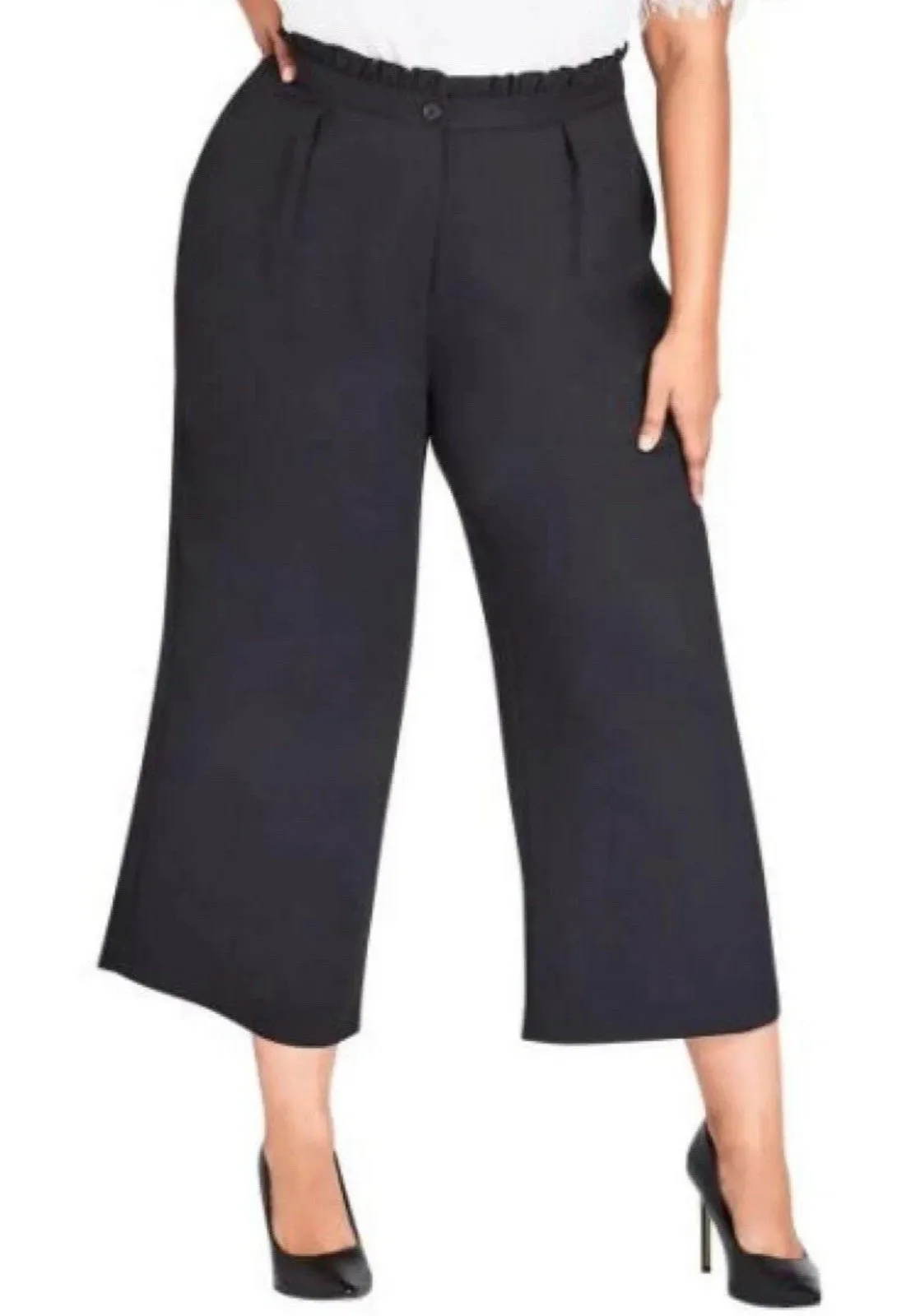 These NWT City Chic Black Frill Waist Pants in size XL/22 are perfect for a business setting with a high rise and wide-leg silhouette. Made from a polyester and elastane blend, these pants feature a flat front and a cropped inseam, making them a stylish and versatile option for the fall, winter, and spring seasons. The black color and solid pattern add a classic touch to these plus-size dress pants from a trusted brand like City Chic. Measurements (approximate, from flat lay): Waist 21" Hip 28" Rise 15.5" Inseam 25"
