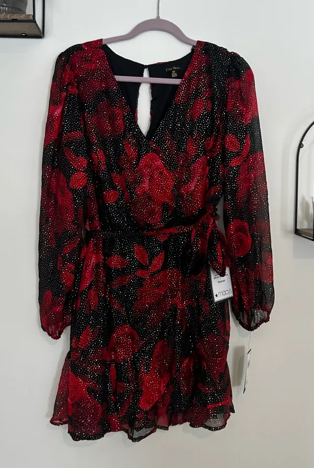 NWT City Studio Red & Black Rhinestone Sparkly V Neck Floral Dress Size 17 Measurements (approximate,) taken flat: Bust (from pit to pit:) 20.5” Waist: 16” Sleeve: 23.5” Length: 35.5” Semi sheer long sleeves. Deep v neck. Open cutout on back with button at neck. Mini length. Elastic at end of sleeves. Tie at waist. This is in new condition. Items shipped same or next day. Weekend orders shipped Monday.