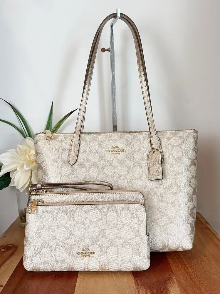 NWT Coach Fiona Zip Tote Bag and Double Zip Wallet In Signature Canvas Color IM/Champagne Multi Tot... Show more