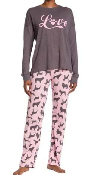 NWT COZY ZOE Love Dogs Long Sleeve Pajamas set/ Size Small Snuggle up with your furry friend in this cute dog printed long sleeve shirt and pajama pants set. 2-piece set Top: 24" length; Bottoms: 10.5" rise, 31" inseam (size S) Top: crew neck, long sleeves, front graphic print, knit construction, vented hem Bottoms: drawstring waist, pull-on style, allover print, knit construction 55% cotton, 45% rayon Machine wash, tumble dry low P-1