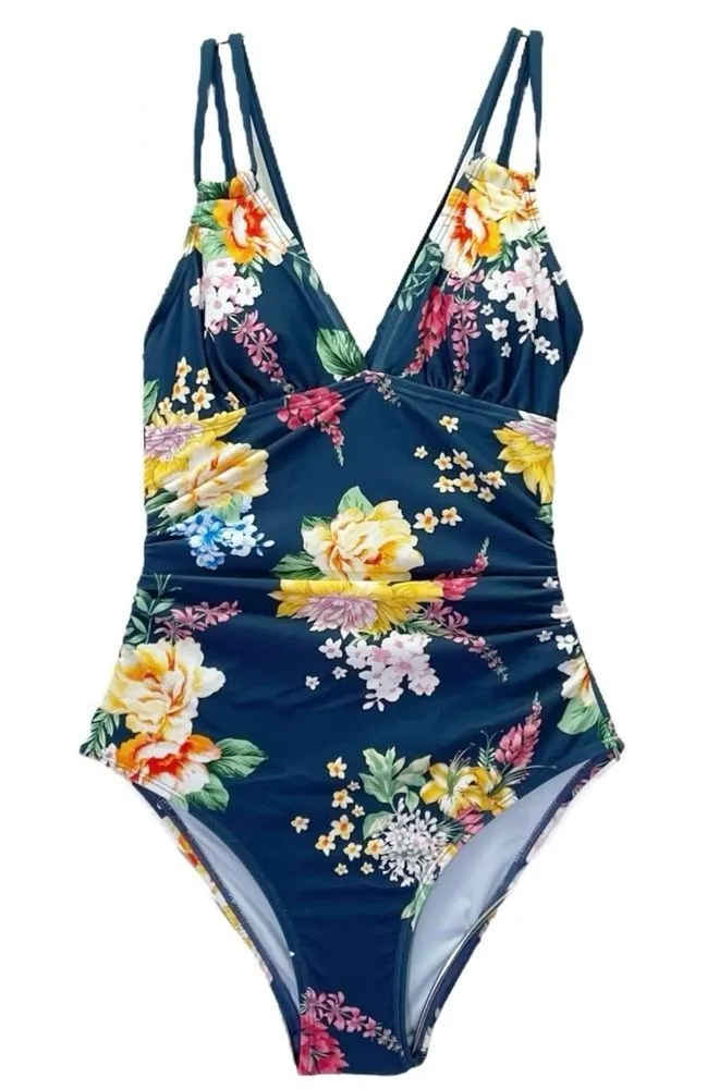 Make a statement in this Cupshe Tropical Floral Cutout One Piece Swimsuit. Features a vibrant multicolor floral print on a soft navy base, a plunging neckline, and eye-catching back cutouts with O-ring detailing. Designed with adjustable straps, removable soft cups, and classic bum coverage for a flattering and secure fit. The bold cutouts add a playful twist to this beach-ready style.