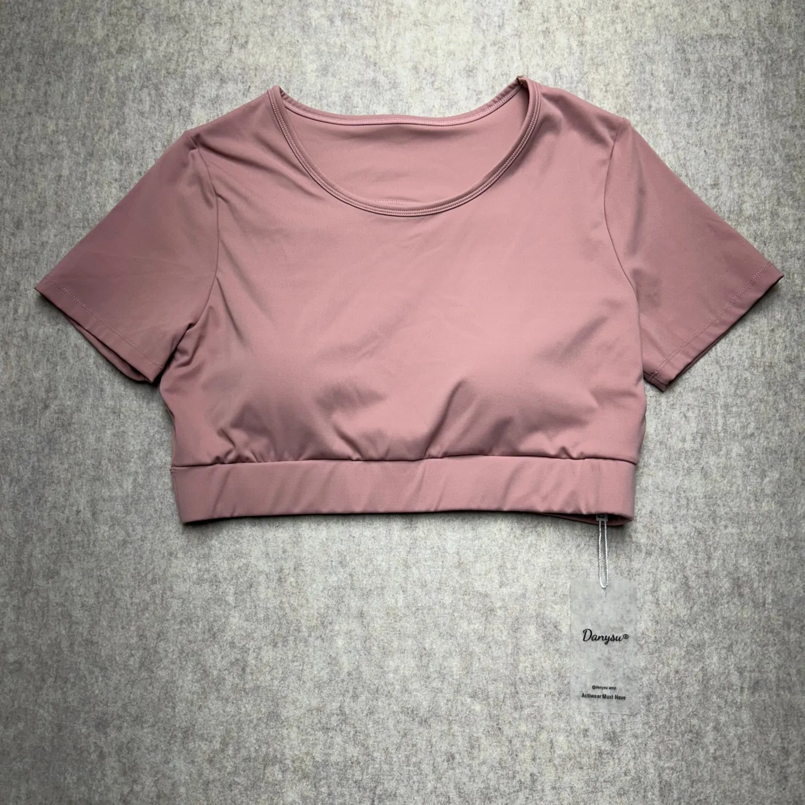 Mauve workout crop top designed for active lifestyles. This piece features a comfortable crew neck and short sleeves, complemented by a supportive elastic band at the hem. The open back design provides ventilation and a stylish touch, while an inner mesh lining offers added support and breathability. Perfect for yoga, gym workouts, or casual athleisure wear, this top combines fashion and function seamlessly. Built in bra. Color: Pink Department: Women Type: T-Shirt Style: Cropped Features: Open Back, Breathable, Elastic Waist, Mesh Lining Neckline: Round Neck Performance/Activity: Yoga, Gym & Training, Pilates, Cross Training, Walking Sleeve Length: Short Sleeve Fit: Athletic Closure: Pullover Keywords: workout top, crop top, activewear, gym top, yoga top, open back, mauve, darysu, athletic top, exercise top, short sleeve top, fitness apparel, sports top, cropped workout top