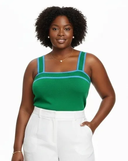Square neckline Pullover style Knit fabric Ribbed trim accents Stretch Fitted silhouette Viscose elastane polyamide blend Sleeveless Colorblock pattern Minimalist Clean Girl Neutral Quiet Luxury Capsule Wardrobe Everyday Coastal French Girl Scandinavian Also available in tan Approx. Measurements: Pit to pit: 18–23" Length: 23"