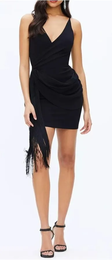 NWT Dress The Population Women's size Large Alida Black Fringe Sleeveless Mini Dress. Dress The Population brand women's mini dress in a size large. Item is new with tags attached. Black colorway with fringe at the hip. Spaghetti straps, adjustable. Zipper closure at the back. Bodycon style mini dress, tight at the hips. Measurements as pictured. In great condition, see photos for more details. Always feel free to ask any questions you may have! Reasonable offers accepted. cocktail, mini, bodycon, fringe, wrap, wedding guest, party, nye