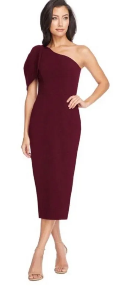The Tiffany is an elegant asymmetrical dress made in our stretch crepe material. A large bow drapes over the single shoulder strap. The form-fitting silhouette has a straight, midi-length skirt that tapers in at the waist completed with a back slit. An elegant one-shoulder neckline and figure-hugging silhouette style a sophisticated midi dress with two panels that cascade over the single shoulder. 43" length (approx) One-shoulder neck Sleeveless Lined 97% polyester, 3% spandex Dry clean or machine wash, line dry Imported Dark Magenta in color Size XS $148