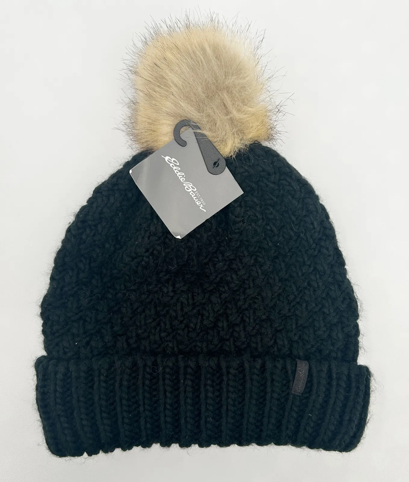 Keywords: Eddie Bauer, Beanie, Knit Hat, Winter Hat, Faux Fur Pom Pom, Pom Pom Beanie, Black Beanie, Womens Hat, Cabin Style, Outdoor, Ski Hat, Snow Hat, Warm Hat, Acrylic, Polyester